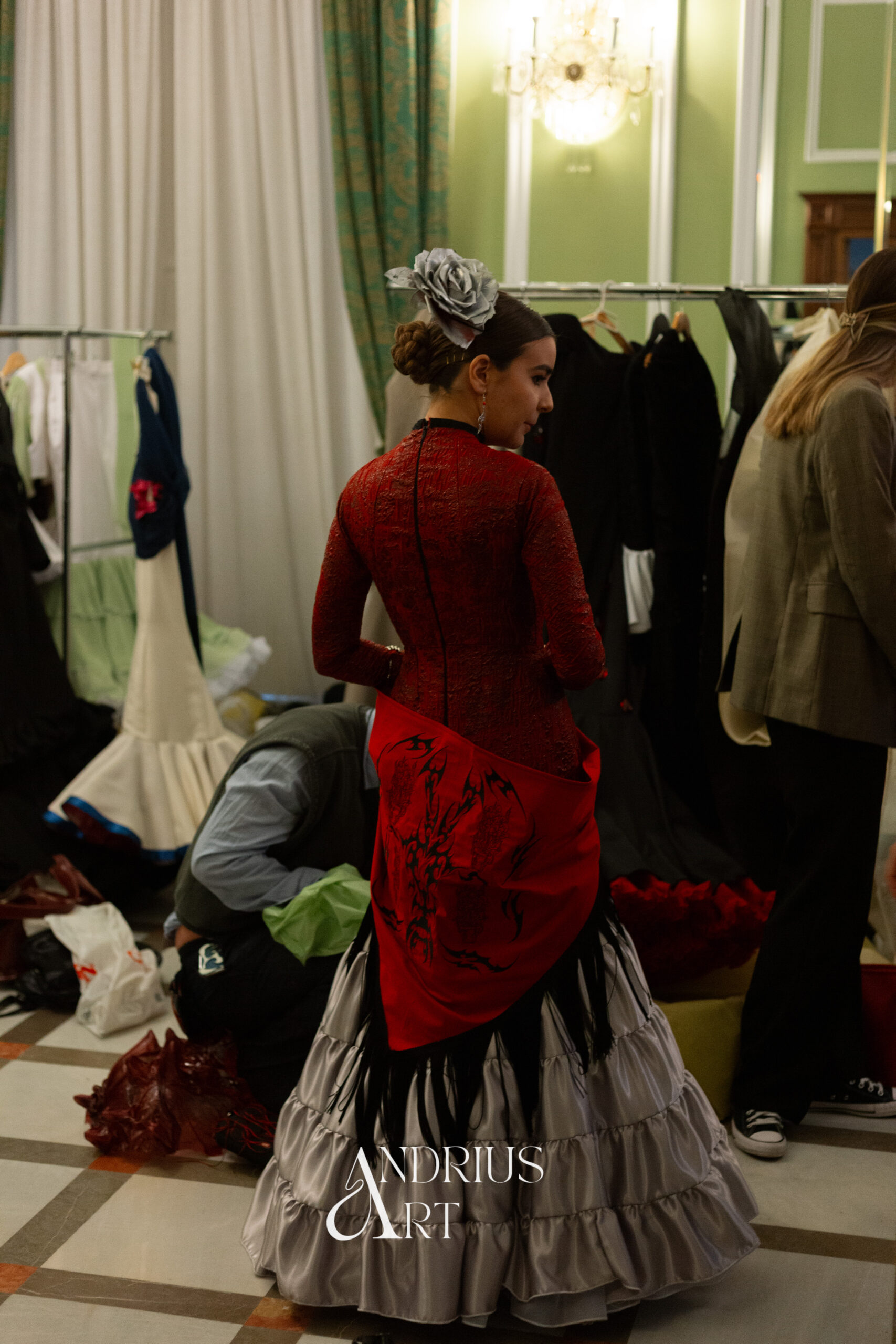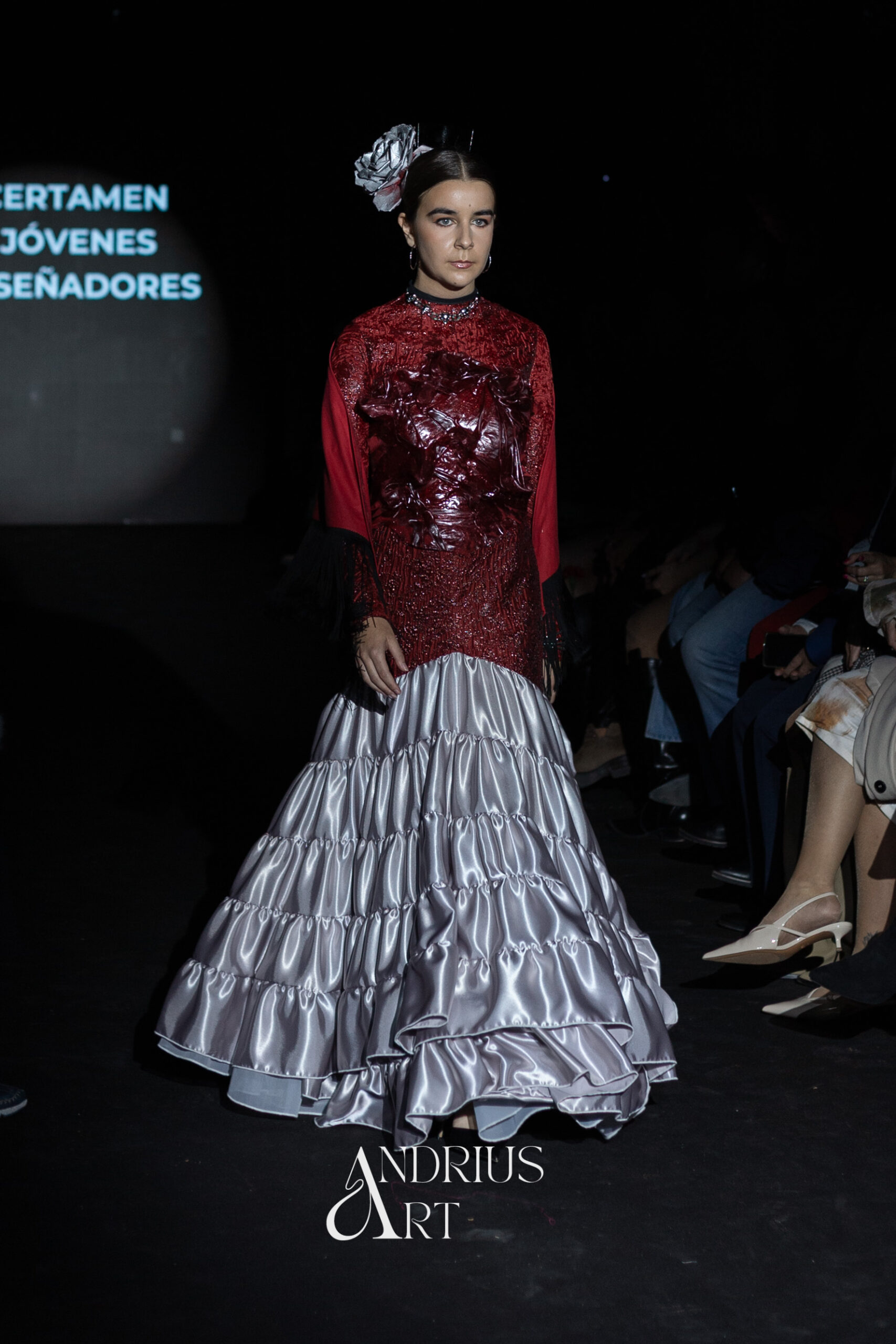 El corsé con púas se ha creado a partir de resina aplicada sobre una pieza de gasa, moldeada directamente sobre el maniquí para dar forma a cada pincho. El mantón, diseñado íntegramente por mí, propone un motivo tribal inspirado en un patio andaluz en llamas. La falda canastera plateada alude al universo industrial y áspero del techno, y junto con las cadenas del estilismo y la rosa metálica en la cabeza, construye un conjunto agresivo, seguro y lleno de carácter.