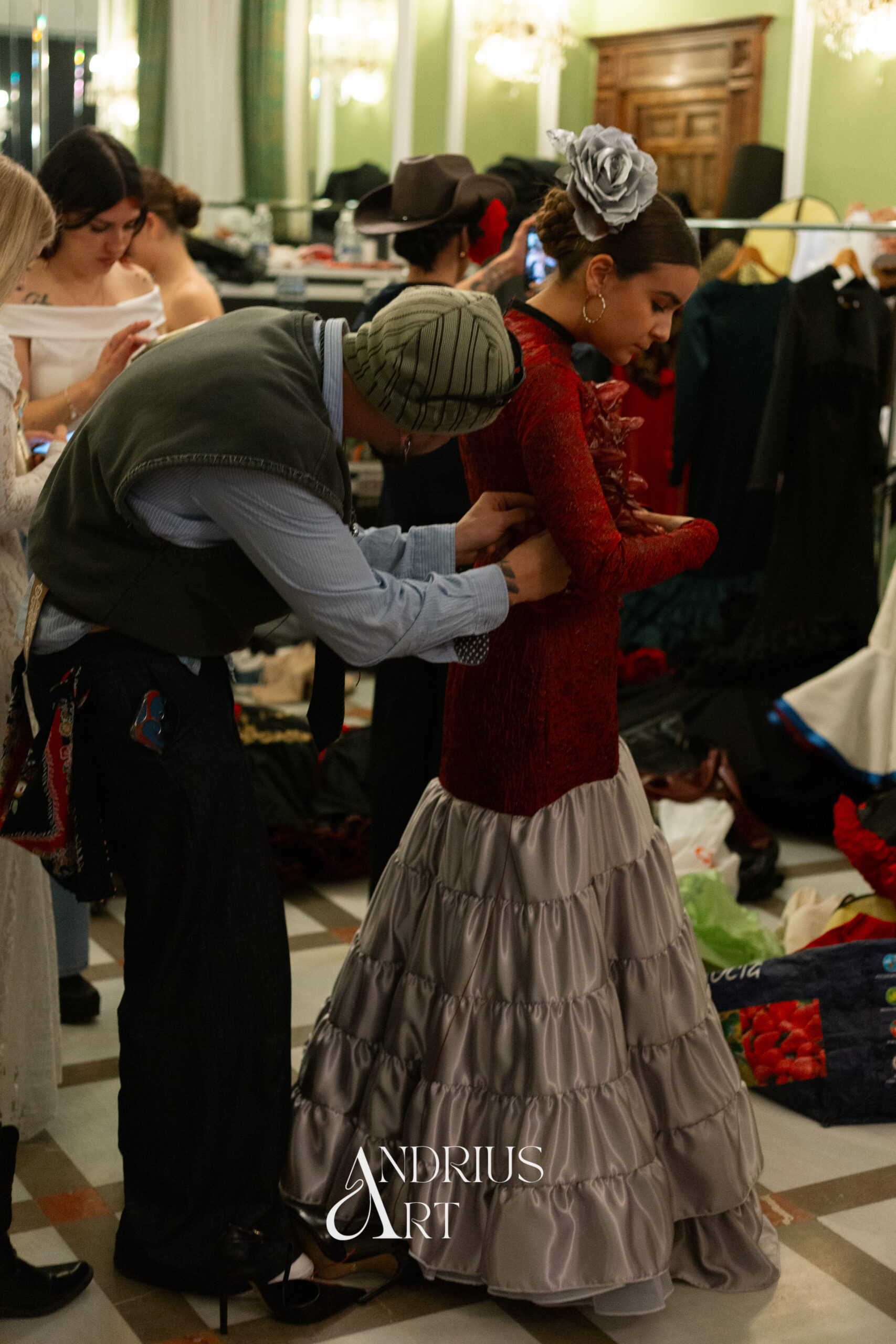 Este look plantea un diálogo intenso entre la cultura rave y la tradición flamenca, dos mundos que, aunque aparentemente opuestos, comparten una misma pulsión: la expresión visceral del cuerpo en movimiento. La silueta parte de una base clásica, pero pronto se retuerce hacia una estética experimental y nocturna.